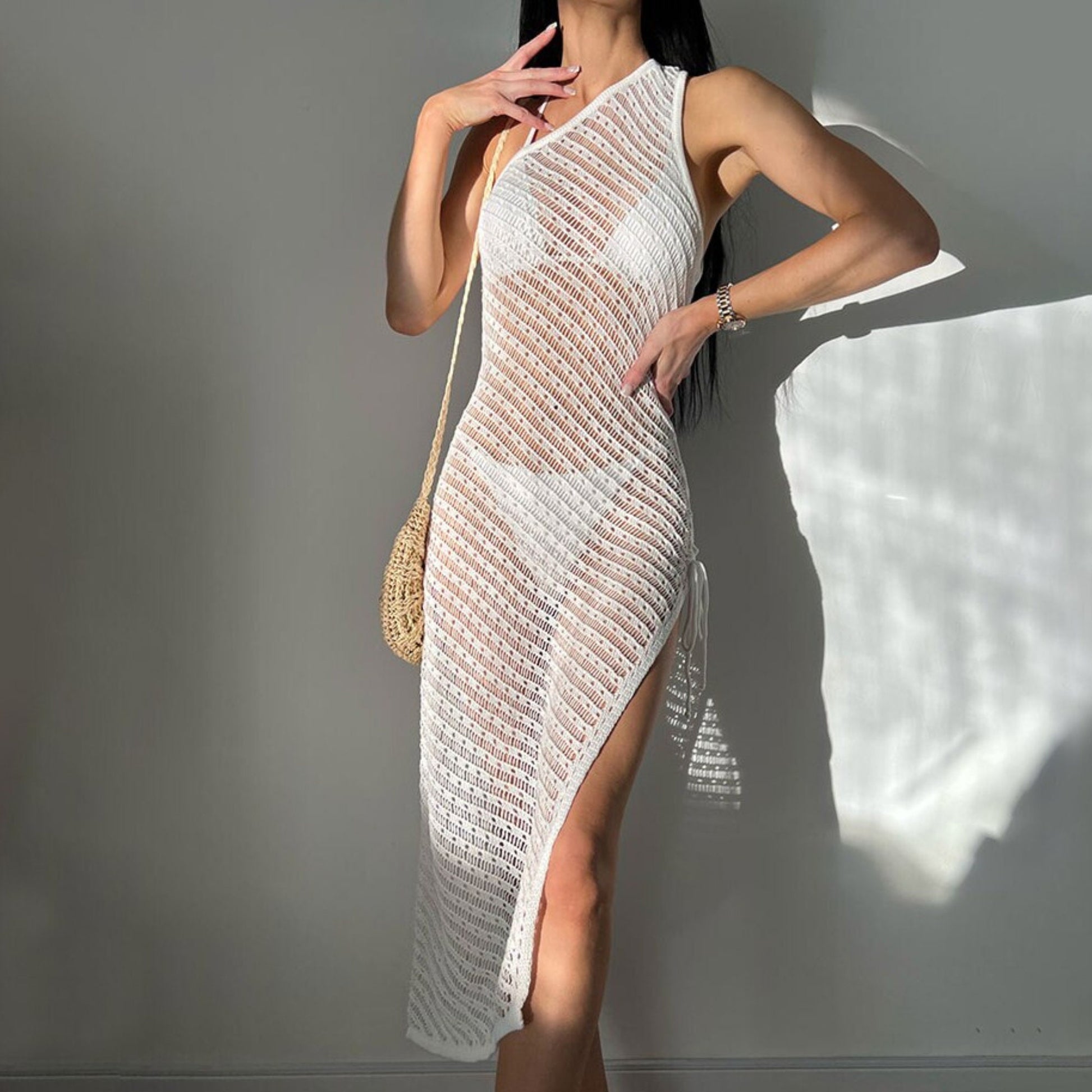 Look and feel your best in this stunning beach cover up. This elegant one shoulder design is crafted from white knitted material and features a Venus cut to accentuate the waist. The high side slit adds an extra element of allure, while still granting you full coverage. Perfect for your next beach getaway, slip into this stylish piece of summer wear to embrace the sun and feel confident in your own skin.