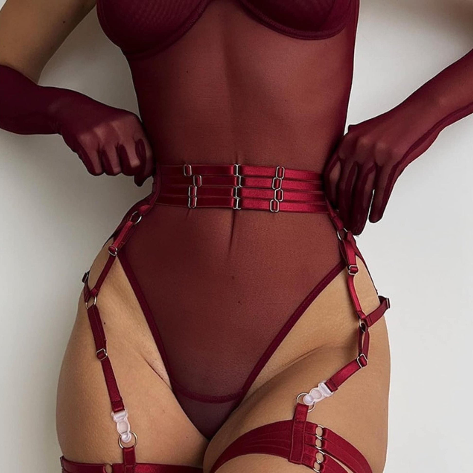 Introducing our stunning Burgundy See Through Bodysuit With Gloves Garter, a tantalizing night club outfit that effortlessly blends sensuality and style. Crafted with exquisite attention to detail, this provocative ensemble features a tight-fitting sheer lace bodice that accentuates your curves, while the alluring see-through mesh top adds an element of intrigue. The inclusion of gloves garter provides an elegant touch, enhancing the overall allure of the outfit. Designed for those who embrace their inner confidence, this uncensored lingerie is perfect for making a bold statement, whether you're hitting the dance floor or indulging in a private rendezvous. Get ready to turn heads and unleash your seductive prowess with this irresistible ensemble.