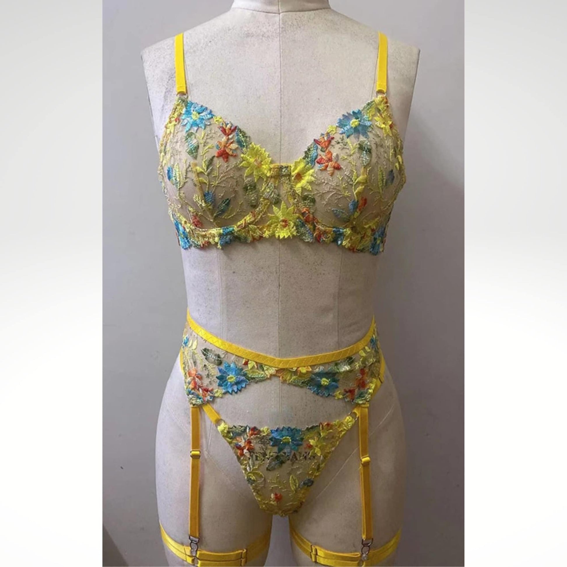 Look and feel amazing in this gorgeous Lingerie See Through Floral Lace 5PC Set. This dreamy yellow lingerie is made with ultra-thin sheer lace to add a touch of romantic allure to your boudoir look. With a luxurious combination of delicate lace, sweet bows and daring cutouts, your wedding night never looked so sexy and beautiful. Make this bridal lingerie set part of your precious wedding night memories. You'll be sure to make the most sensual entrance with this romantic yellow lingerie set.
