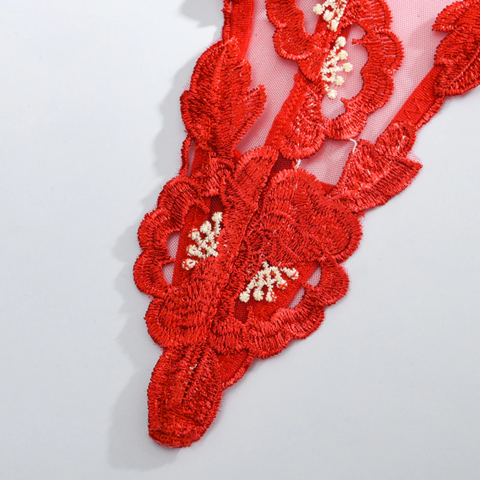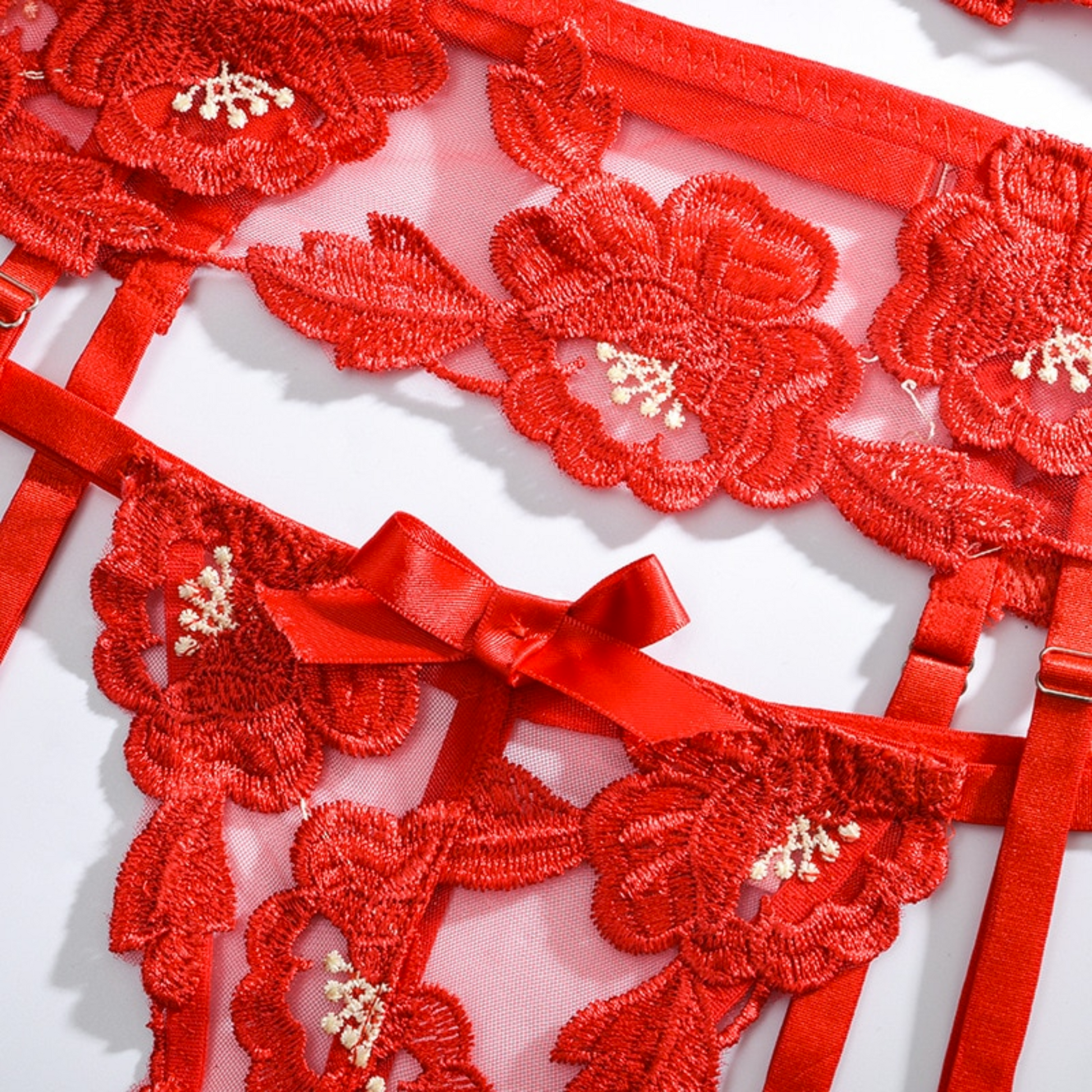 Get ready to indulge in the most romantic and sensual experience of your life with this gorgeous Valentine's Day lingerie set. The Red Valentine 3-Piece Floral Embroidery French Lingerie Set features stunning flower embroidery with accents, while the matching thong features delicate French embroidery against a sheer red fabric. The set is finished off with matching satin bows on the front of the bra.