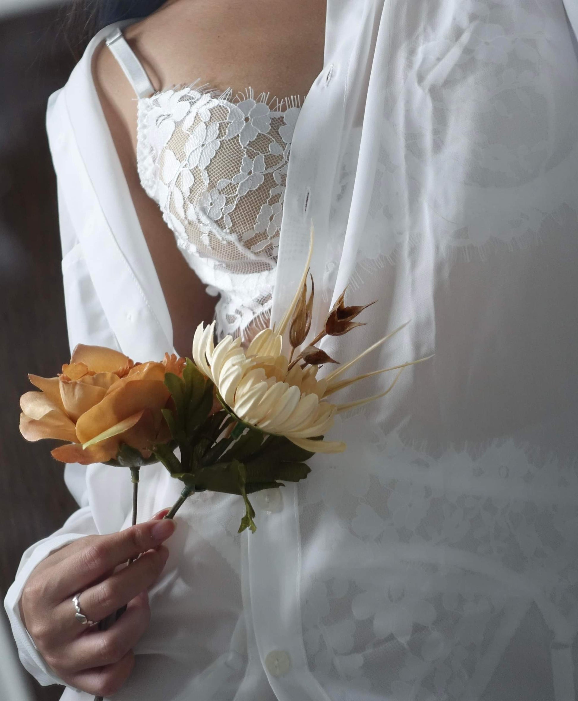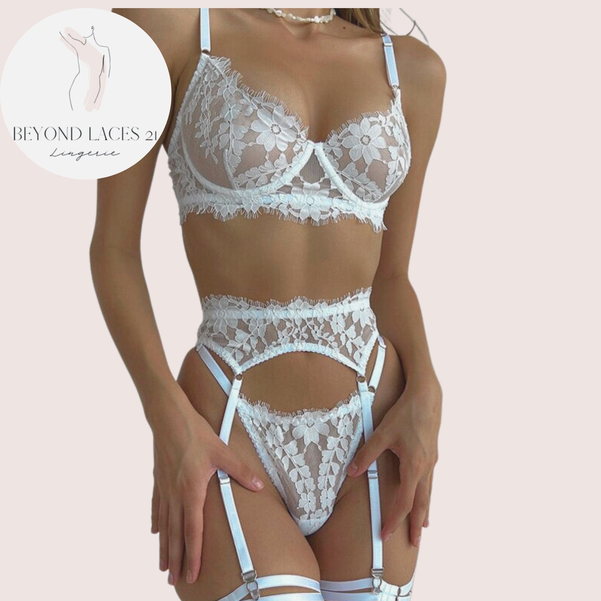 The dream of every bride is to find the perfect wedding lingerie set. Well, look no more! We are here to help you find the perfect set by yours truly. This set has 4 pieces (bra, panty, belt and garter) and is ideal for any occasion: daytime, cocktail party or wedding night. The light blue floral embroidery adds a touch of romance and elegance to your everyday life. It can be worn as bridal lingerie or any other time of the day.