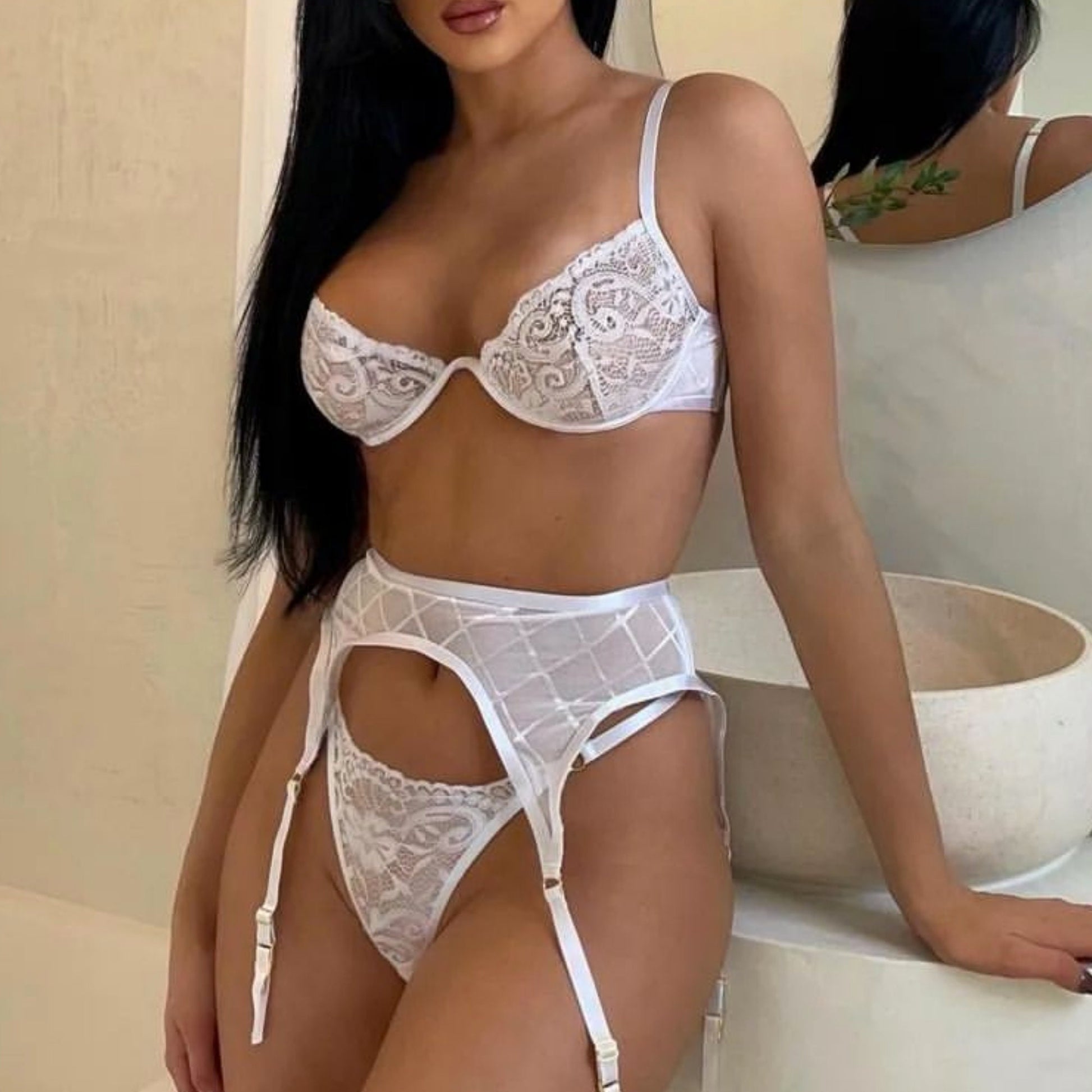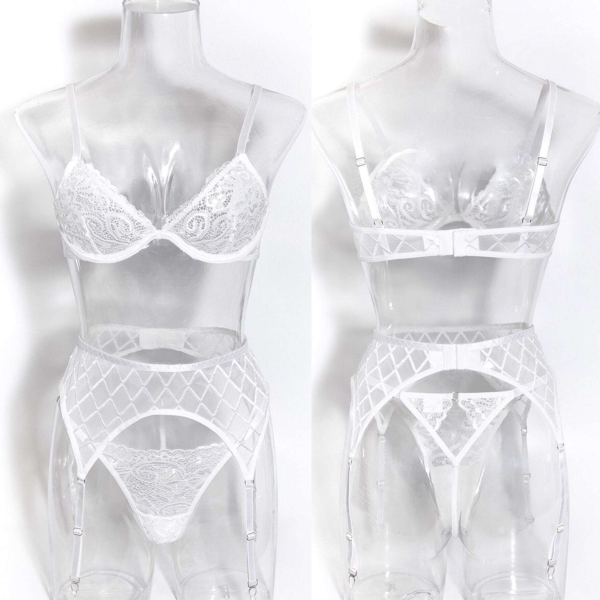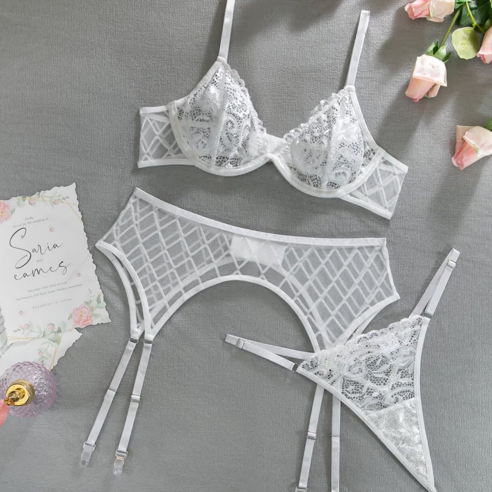 Get ready for the most special night of your life with this Bridal Lingerie Wedding Night Set. It features three pieces of white ultra-thin sheer lingerie, making it the perfect combination of alluring and romantic. Whether you're taking bride-to-be photos or getting ready for your wedding night, this lingerie set is sure to make you look and feel beautiful. Plus, its see-through fabric offers an up a seductive edge so you can look and feel your best. Now, that's something worth celebrating!